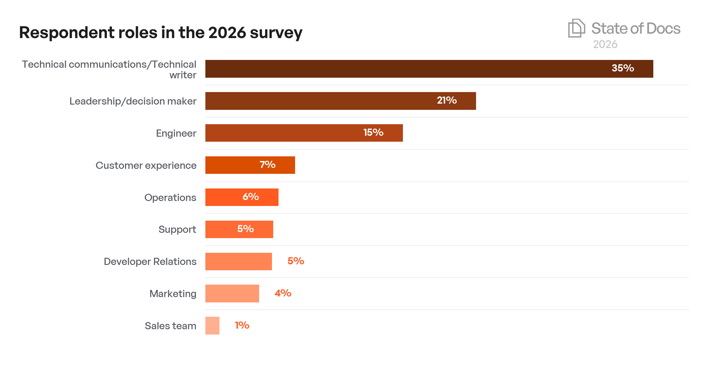 Technical writers are the largest group at 35%, but they're not the majority. The remaining 65% includes leadership and decision-makers (21%), engineers (15%), customer experience (7%), operations (6%), support (5%), developer relations (5%), and marketing (4%). This mix means the survey captures the perspectives of people who write docs alongside the people who fund them, build the products they describe, and use them to support customers. Documentation touches all of these roles, and the data reflect that.